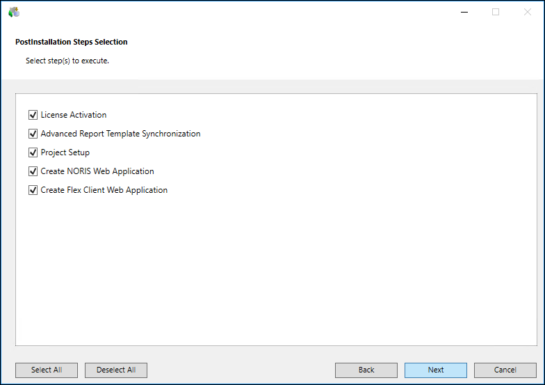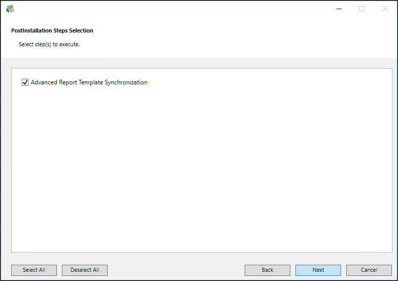 Click Deselect All to deselect all the listed post-installation steps in the PostInstallation Steps Selection dialog box. - Click Select All to select all the post-installation steps.