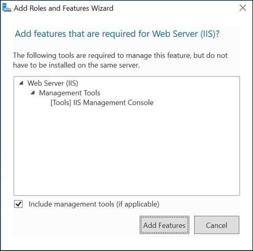 b. Click Add Features. Web Server (IIS) gets selected. - The feature Web Server (IIS) gets added.