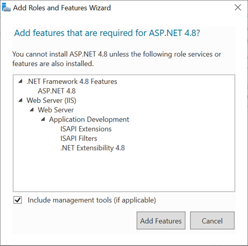 d. This opens a dialog box asking you to confirm adding additional features that must be installed for ASP.Net 4.7 or ASP.Net 4.8.