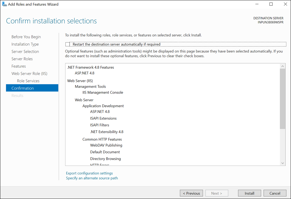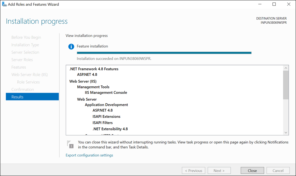 - The features are installed and IIS is configured.