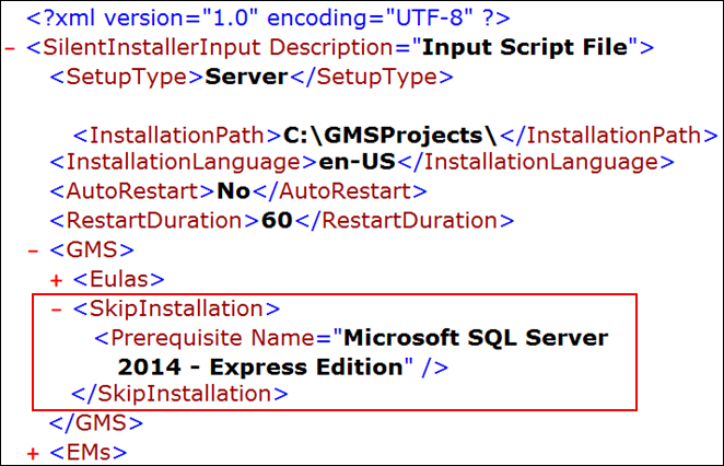 - Silent Installation: The Prerequisites Installation Folder path is mentioned in the XML file (GMS Platform.xml). In case of incorrect path or warning result, a default installation path is used.