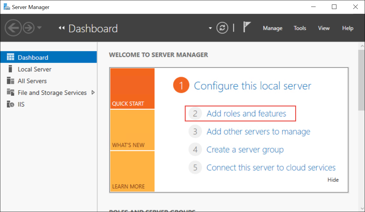 b. On the Windows Start screen, click Server Manager. If it is not there, type Server Manager in the Search field. - On the Manage menu, click Add Roles and Features.