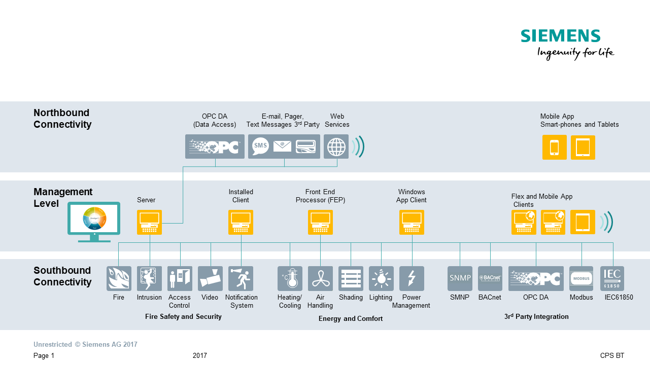 Desigo CC is a client/server system designed to augment existing building infrastructure and integrate with standard IT hardware, software, and networks. The open and adaptable architecture supports the most common Windows-based IT infrastructures.