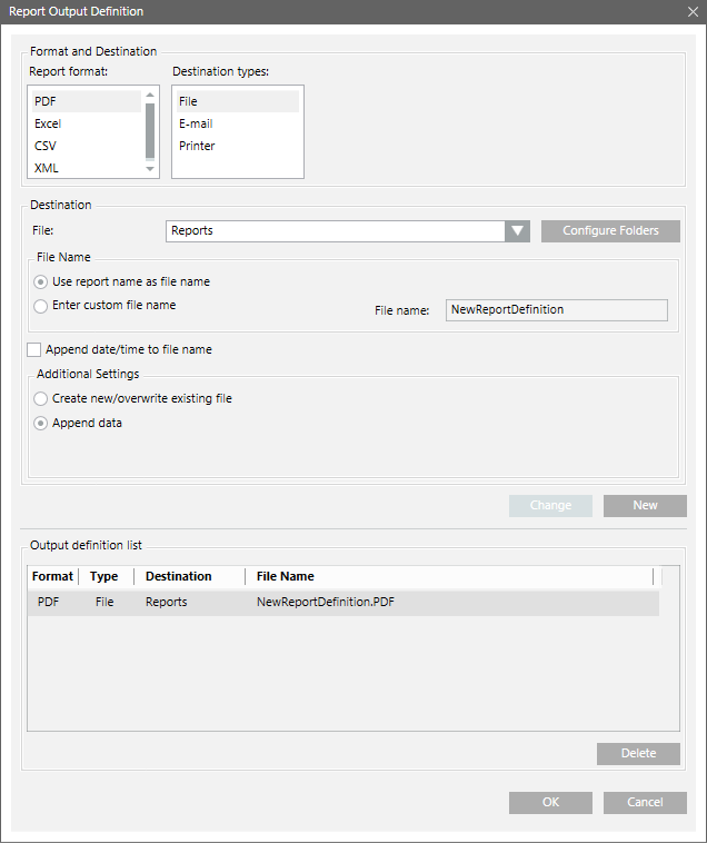 The Settings tab allows you to configure the output format and destination for a Report Definition.