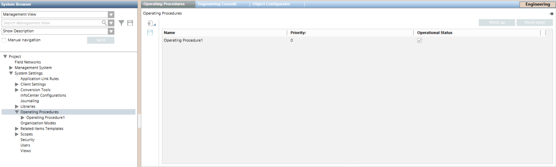 Operating procedures are located under System Settings > Operating Procedures in the Management View of System Browser. They may be further organized into subfolders under the main Operating Procedures folder.