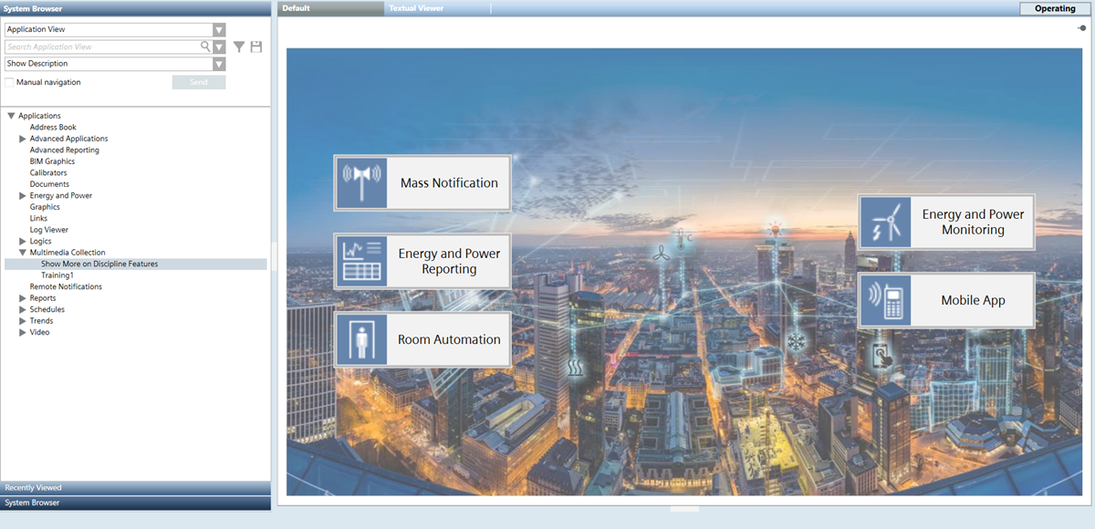 When you select a multimedia collection (for example, Show More on Discipline Features) in System Browser, the Default tab displays a welcome page with a button for each topic configured (in this case, discipline buttons such as: Mass Notification, Energy and Power Reporting, Room Automation, and the mobile app). Clicking one of the buttons results in the corresponding media file being played on the right while the buttons stay available on the left. The typical player buttons are also available to start, pause, stop, and mute the media file.