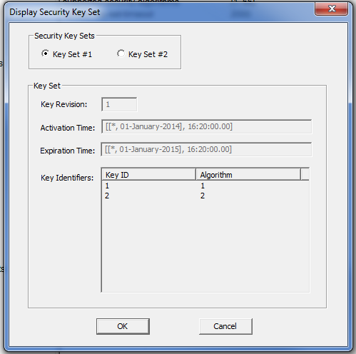 The Display Security Key Set dialog box allows you to view the contents of the devices 2 key sets. The dialog box displays read-only properties of the key sets.