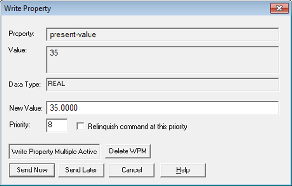 Priority | Allows you to enter a different priority level for the selected object, if desired. Check the Relinquish command at this priority check box if you want to relinquish a previously issued command at this priority. Click Send Now to command the new value. This updates the right pane in the BACnet Object Browser window. |