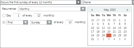 ‒ Selection the options First, Sunday every 12 months. - Open the Output > Action expander.