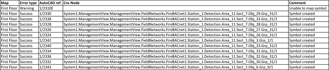 NOTE: In the example below, note the error in mapping one of the objects due to the slightly different content of the AutoCAD attribute (the letter “E” after the numeric code). In the import setting (see 3 – Select the Object Blocks, and Identification Attributes), you can correct such a problem by using the remove-character option to delete the “E” character from the comparing string.
