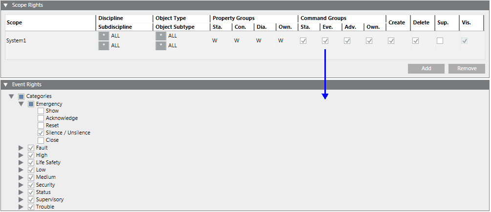 You must select the Eve. check box in the Command Groups section in the Scope rights expander to activate the event rights.
