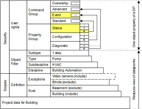 Access rights to an object in Desigo CC depend on various factors. You do not need to define Scopes if you want to assign full access rights to a user group. To operate and monitor, you must assign write rights for the property group and enable the command group. The following diagram illustrates full access rights: