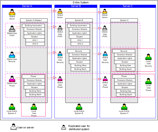 Global user groups and users can only be created and managed on the master system. This global information is continuously synchronized with the distributed management stations. This means that a replica of the user group or user is created on every known management station. A global user has potentially access to objects on another system.