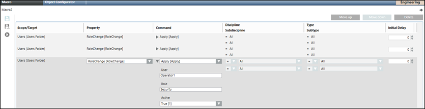 - The macro is saved and displays below the Macros node and the role specified for the user is updated.