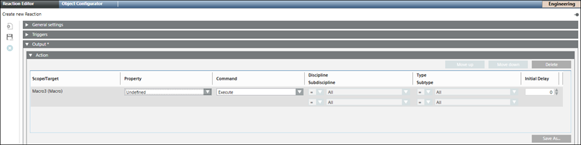 - Drag the macro saved in the Macros node from the System Browser into the empty area inside the Action expander.