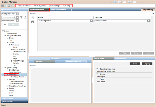 In Engineering mode, when you select Journaling in System Browser, the Journaling Printers tab lets you map a journaling printer to a journaling template.