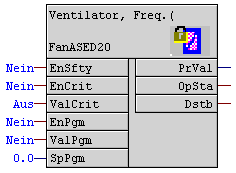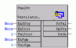The Desigo building automation and control library offers aggregates or component with different variants. The application program is compiled based on the selected variant and then loaded to the automation station. The following information is saved to the data file if a single-stage fan was selected in Desigo.