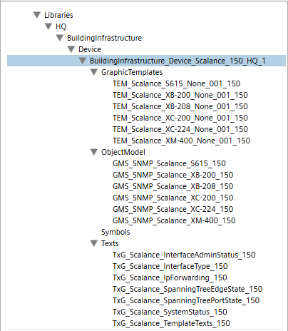 The Scalance extension installs the Desigo CC library BuildingInfrastructure_Device_Scalance_150_HQ_1 that is available at the following path: Libraries > L1-Headquarter > Building Infrastructure > Device.
