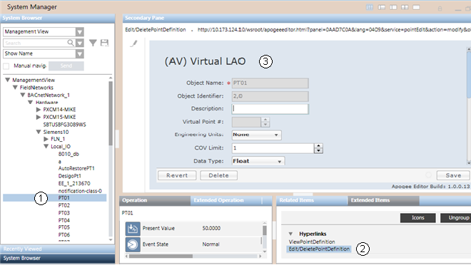 Some aspects of these editors differ slightly in Desigo CC, with different navigation paths and software user interface layouts. The fourth editor, TEC Subpoint, combines elements from the Field Panel Web Server TEC Init Editor and Point Log Report, and also includes new elements.
