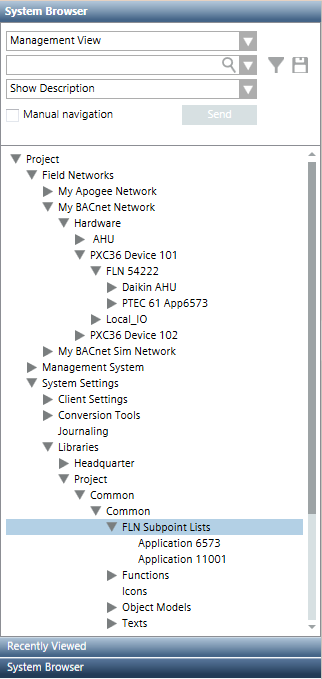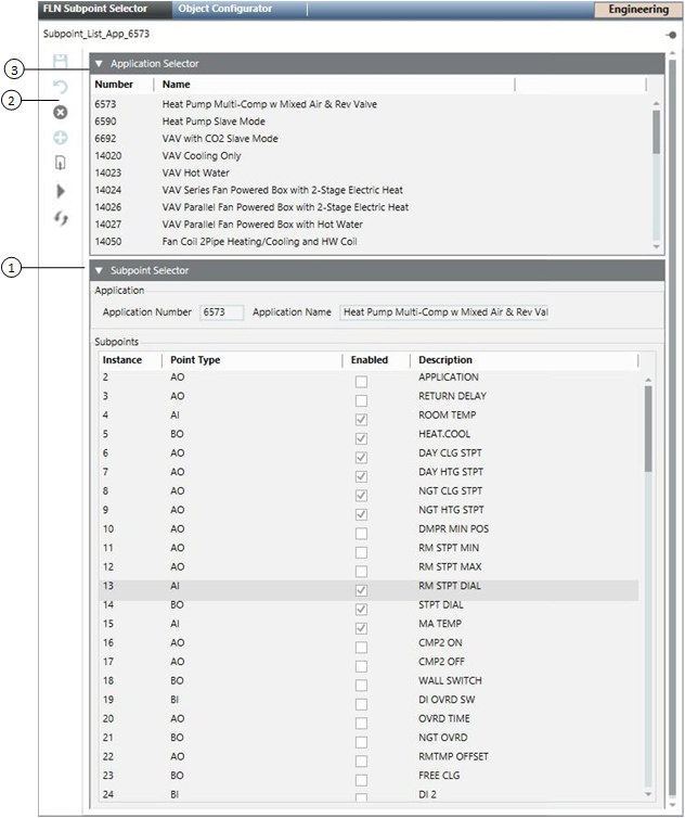 The following screen shot shows the location of FLN Subpoint Lists, which is highlighted. Clicking this node while in Engineering mode displays the FLN Subpoint Selector in the Primary pane.