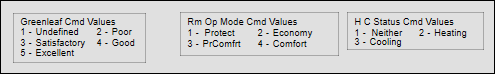 Because the P1 communication protocol does not support multi-state values, multi-state points in P1DXR devices are represented as analog points in Extended Operations. However, the P1DXR graphic templates included with the APOGEE_BACnet_TEC extension module allow the correct state text for multi-state points to display. These templates contain a legend showing proper command values for the analog to multi-state mapping—for example: