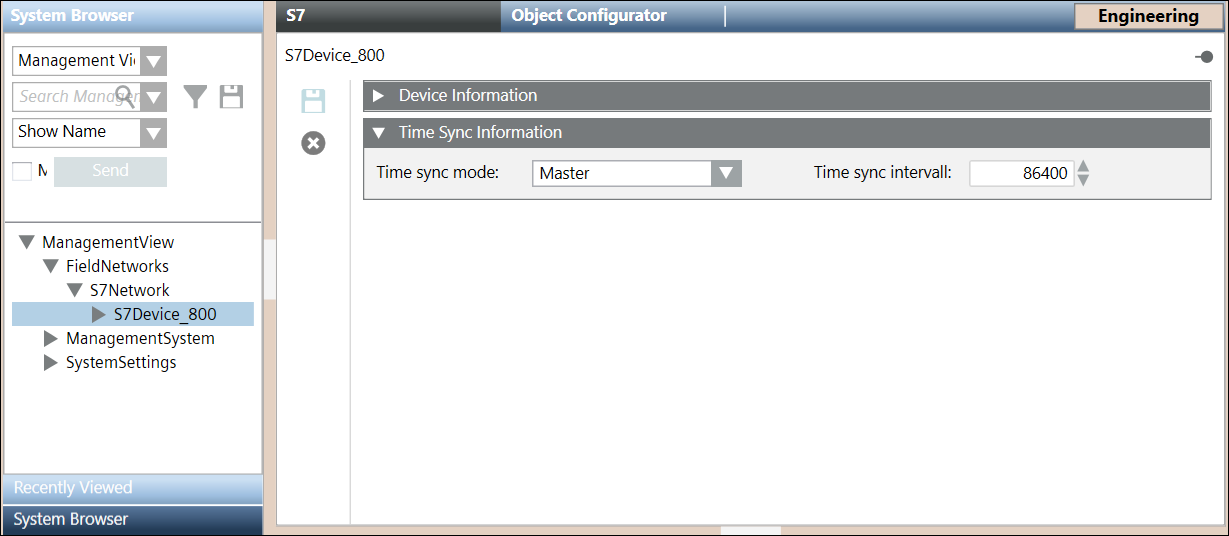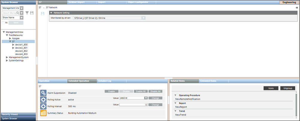 The S7 network workspace allows you to configure the network settings such as associating the Standard S7 driver to the network and saving the association. The properties associated with the selected network display in the Operation tab or Extended Operation tab. You can also change the value of the poll interval. By default, this value is set to 0 ms. In order to delete the network, you must click Delete that displays in the toolbar in the Object Configurator tab.