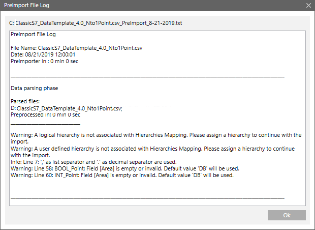 Analysis Log | Displays the Preimport File Log dialog box with the errors encountered during pre-processing phase of the csv file. NOTE: |