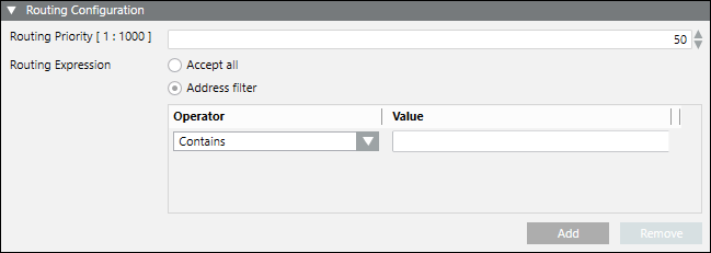 - Address filter: Select to accept only those routing expressions which meet the conditions set under Operator and Value.