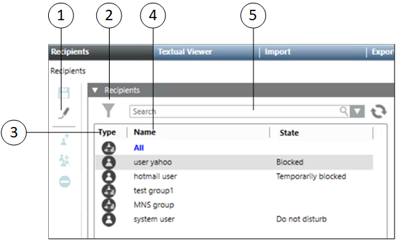 1 | Toolbar | Displays the icons for operations such as Save configuration, Add User, Add Group, , Remove, Import File, Import Recipients from Active Directory, and Export File. |