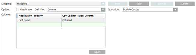 - New: Allows the user to create a new mapping of the Notification properties with CSV columns.