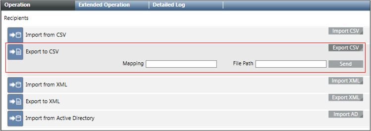 The Export to CSV property on the Operation tab allows the user to configure a CSV mapping and export the recipients to a CSV file.