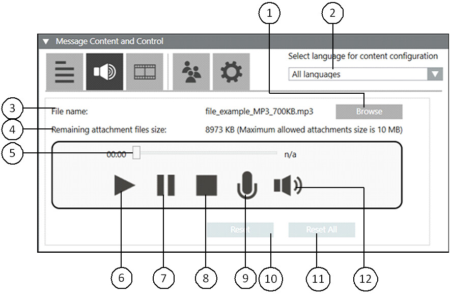 11 | Reset all | Resets the audio file content configured for all languages. |