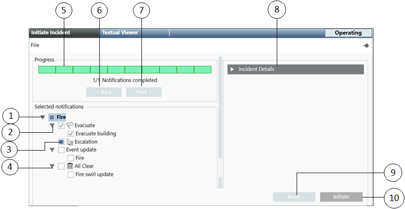 5 | Progress | Displays the progress of the initiating incident process. Once all the steps are successfully carried out, the gray strip turns green completely. |