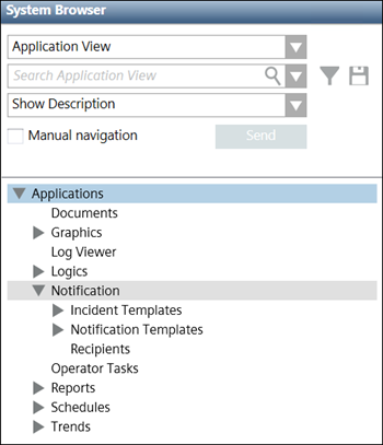 The Browse Incidents tab displays in Operating mode when you select Applications > Notification in the Application View from the System Browser.