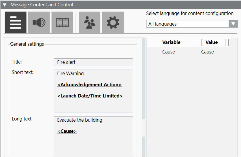 - Select Language for Content Configuration: Allows the user to select the language-specific content entered at the time of message configuration.