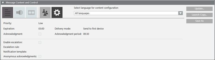 NOTE: When a message template of status category is escalated, an event is generated. - Message Content and Control: Displays details of the message content.