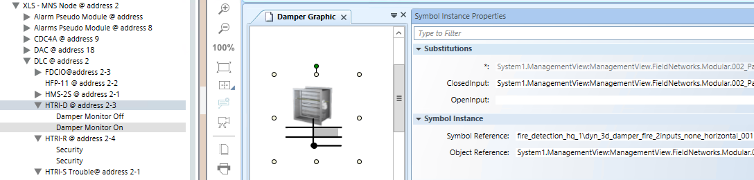 NOTE: Two single-input HTRI-M/S/R or XTRI-M/S/R devices may also be used for representing the open/closed conditions in the damper symbol, but only one general device status can be represented by the symbol. In this case, you can add another symbol to represent the second device.