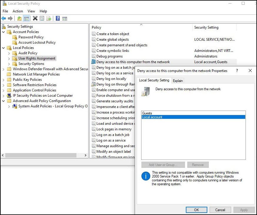 If you change the Port please make sure that they are allowed by Chrome browser, to check this you can browse for unsafe ports by Chrome - Make sure that your Local security policy allows local accounts to access network. If the local account is denied access as shown in the image below, specify a user in the json file with proper access rights for website: