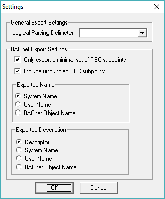 Exported Name: Allows you to select the object naming convention that will be exported: System Name, User Name, or the BACnet Object Name. For more information, see Preparing for a Database Export.