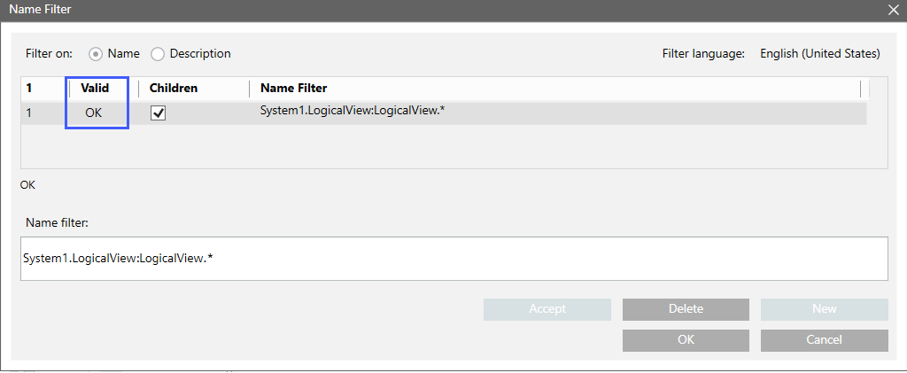 b. In the Name Filter dialog box, check the predefined path for validity and change as needed. In Valid column must showOK