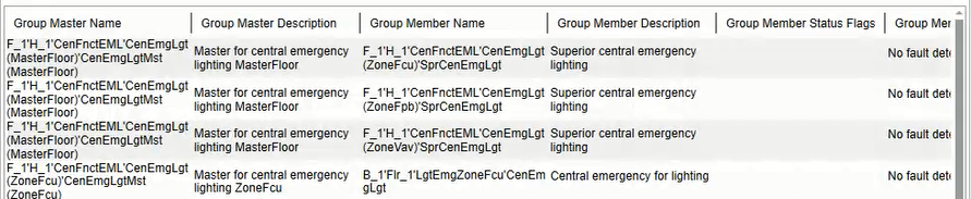 The report shows the assignments between group master and group members. The information is the same as in the Central Function Viewer.