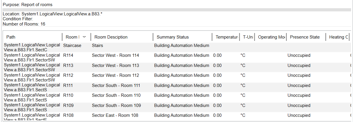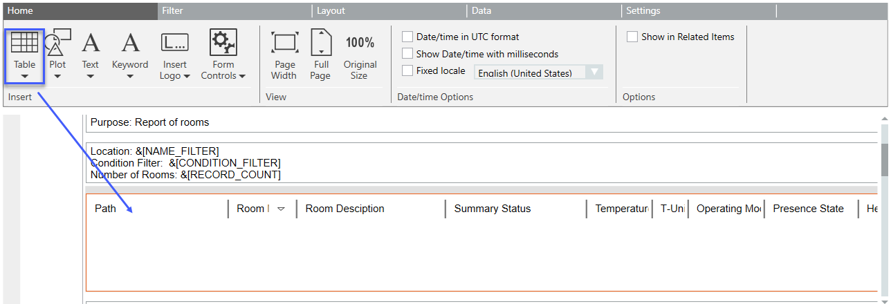 - Select Table and, in the drop-down list box, select Room overview. Drag the Room overview list box to the empty report definition.