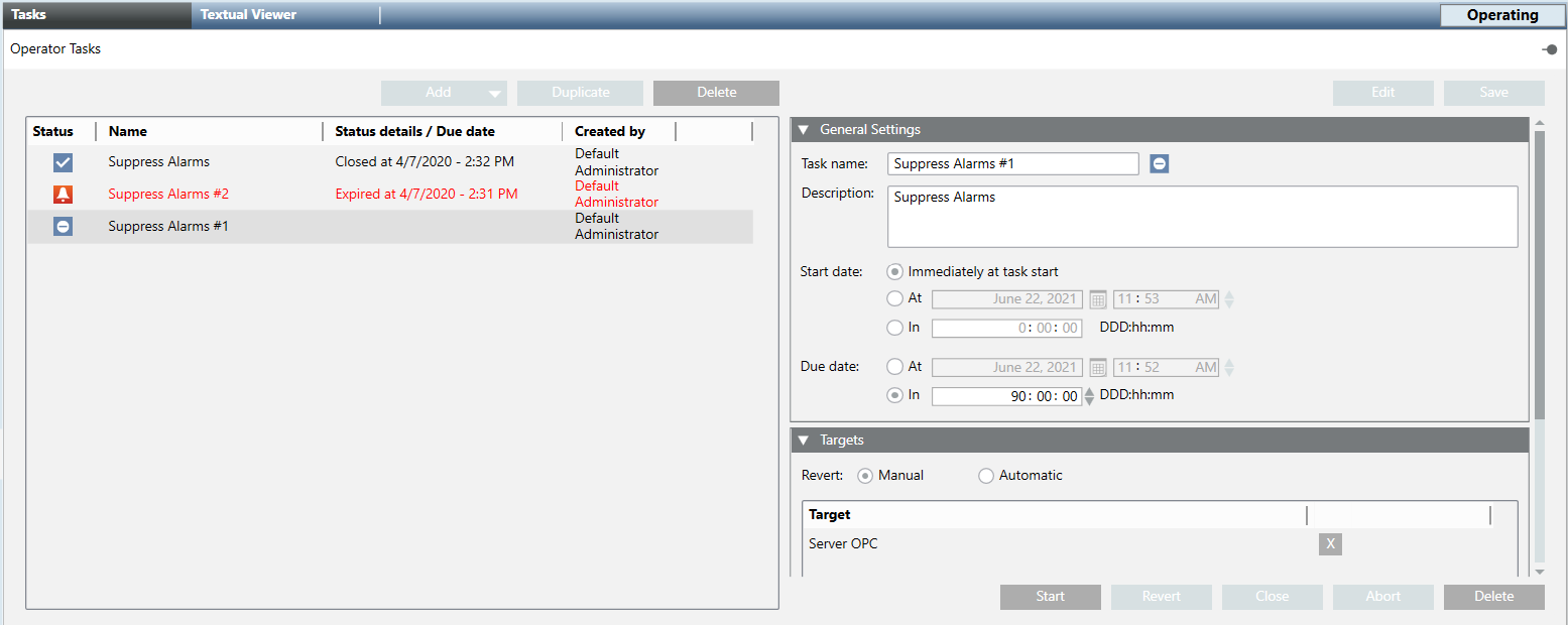 When you select the Operator Tasks object in System Browser, the Tasks tab displays.