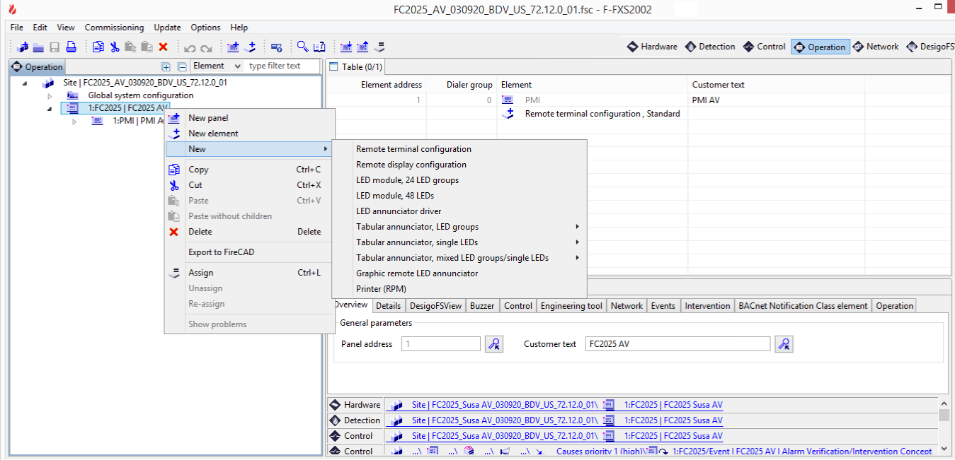 - For FS20 Desigo Fire and FS92 Cerberus Pro, in the FXS tool, configure an annunciator, terminal, or station element as illustrated in the example below.