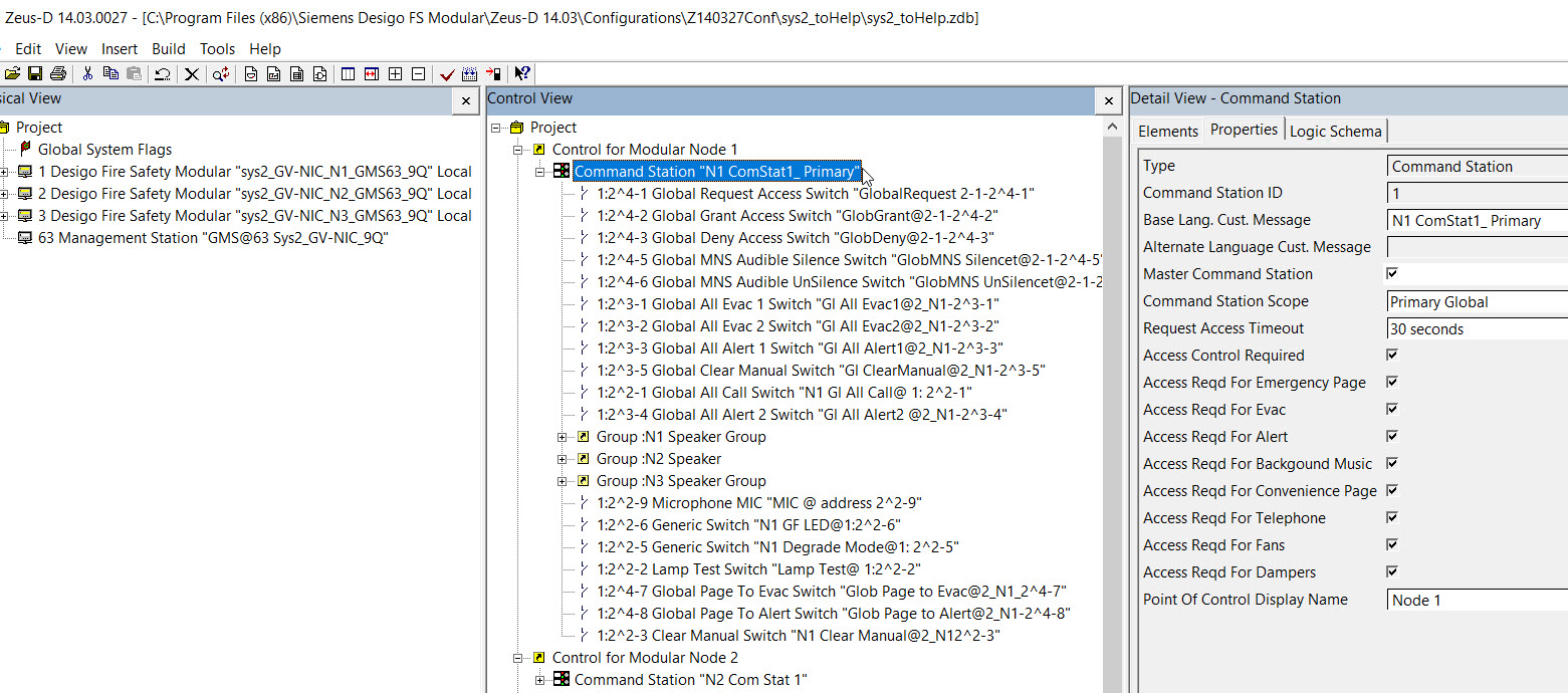 For Desigo Fire Safety Modular, Cerberus Pro Modular, and FireFinder XLS/MXL, in the Zeus tool, configure the Global Command Station as illustrated in the example below.