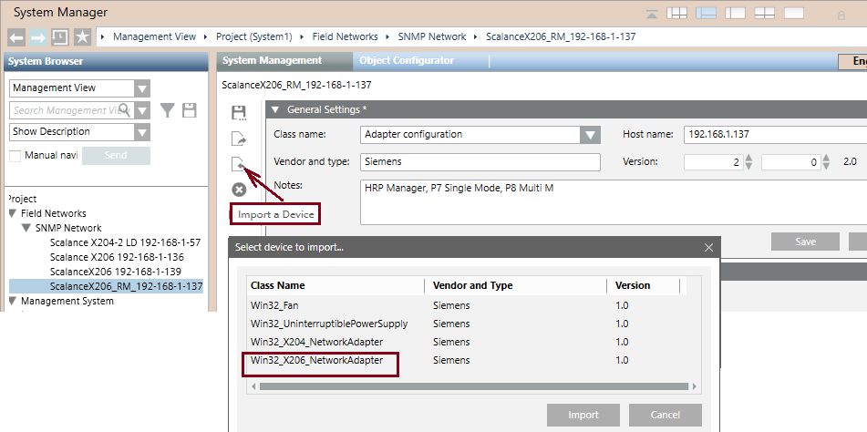 - Import the Win32_X206_NetworkAdapter template, which is provided in the list of predefined devices.