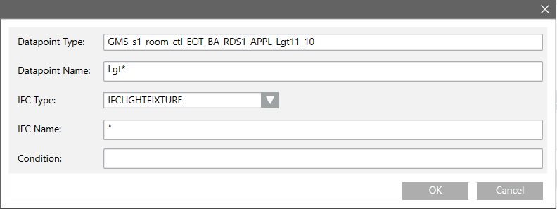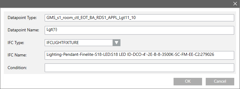 - The assigned lighting object is displayed. The Data point name references the technical address Lgt(1). The object model is displayed in the Data point type column. The IFC Name column references the selected lighting object. The BIM object model IFCLIGHTFIXTURE displays in the IFC Type column.