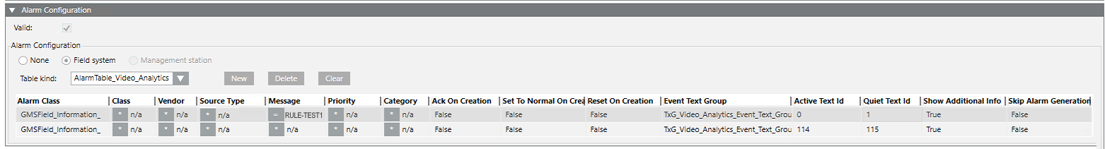 - The completed alarm table should appear as shown below. With this configuration, any analytic events received from the VMS with Message text = "RULE-TEST1" will be displayed in Event List with Texts 0 and 1 (to be configured in the next section). Analytic events with a different message text will continue to be reported as before.