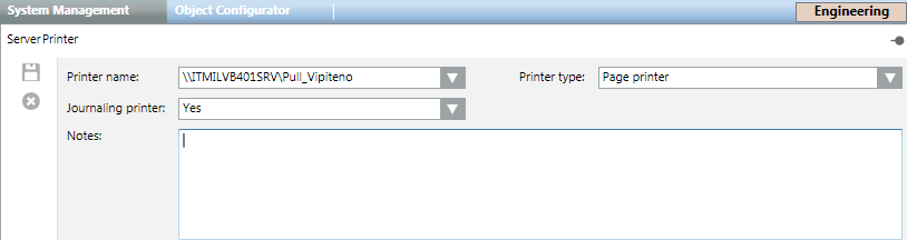 In Engineering mode, when you select a server printer object in System Browser, the System Management tab displays the printer configuration workspace.