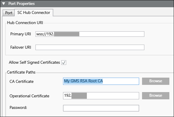 Primary URI | A required field that allows either an IP address or a machine name. If certificates are used, the URI uses the format wss://<IP address or machine name>:<port number>wss://. |